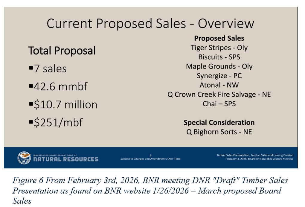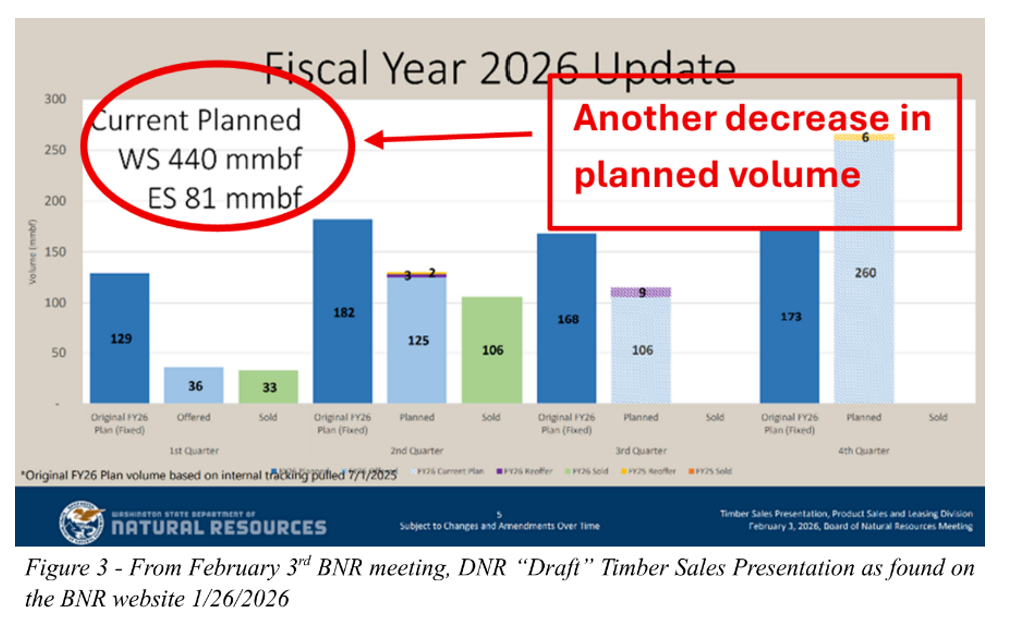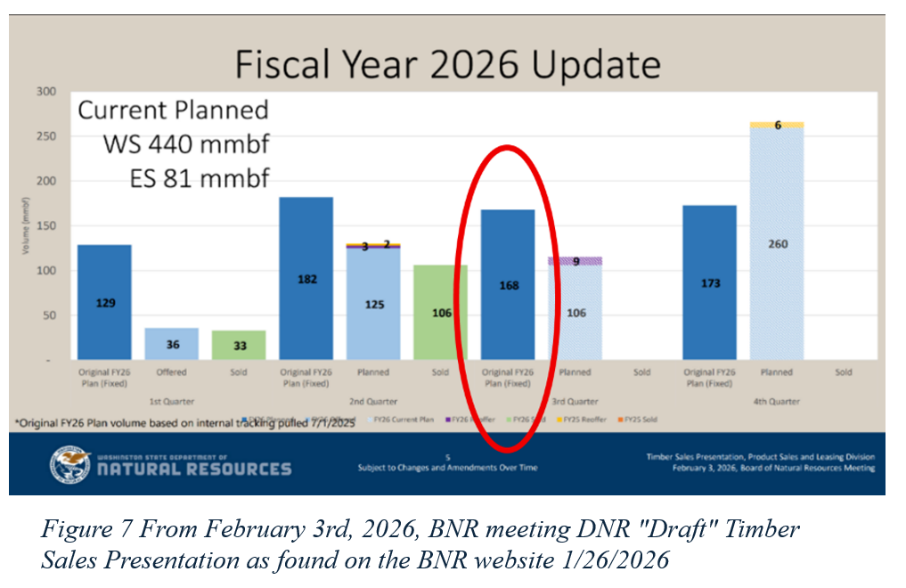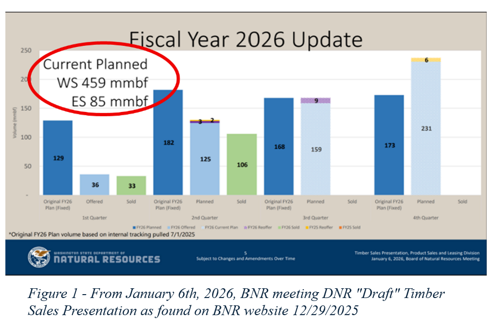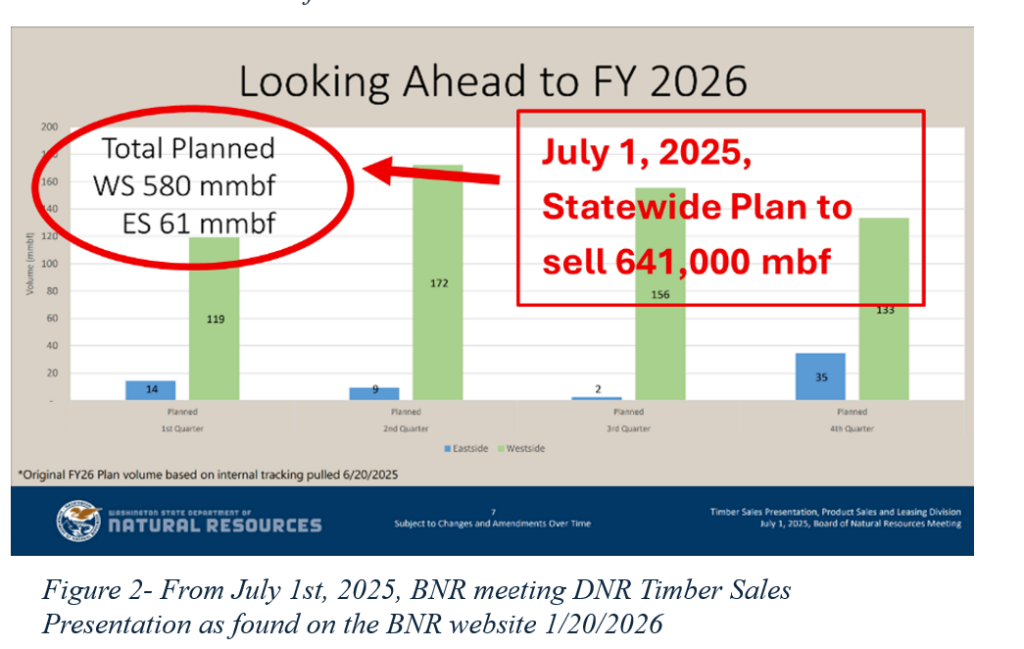 One challenge to accountability is the ever-changing “target” DNR tells the BNR it plans to hit in Fiscal Year 2026. At the January 6th BNR meeting, DNR staff presented a plan to offer for sale a total of 544,000 mbf in FY ’26, or 459,000 mbf in Western Washington and 85,000 mbf in Eastern Washington (see fig 1). DNR maintains two separate and distinct Sustainable Harvest Calculations, one for Western Washington and one for Eastern Washington, which is why the numbers are reported broken out as shown below.