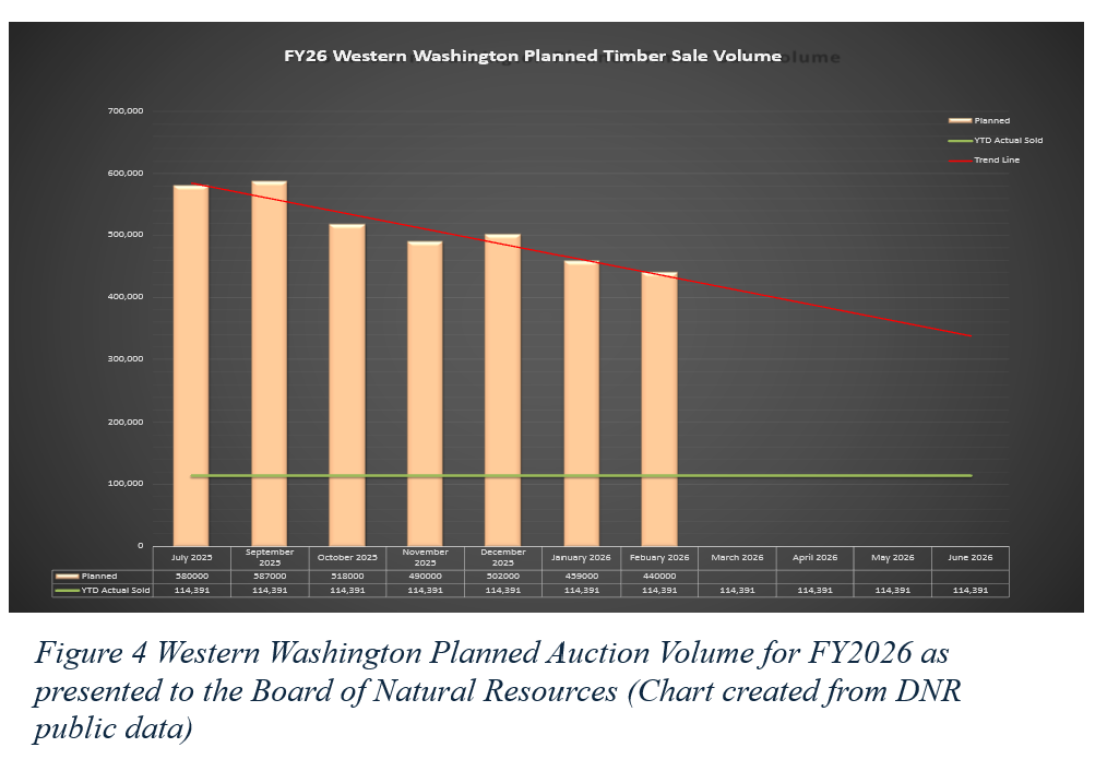 But now, reviewing the draft timber sale presentation for the February 3rd BNR meeting, we see another decrease in the planned sale volume. DNR is now forecasting a Western Washington volume at 440,000 mbf and Eastern Washington volume at 81,000 mbf, for a total statewide volume of 521,000 mbf (see fig 3). This 120,000 mbf reduction in planned volume would be enough to operate roughly 1.5 to 2 sawmills for a year, or about 7,500 standard-size homes. Since the development of this article DNR has recently updated their slide in Figure 3. The current version now shows Current Planned as WS 433,000 mbf and ES as 78,000 mbf. Further questioning what the fiscal year target even is. Since July 1st, 2025 the planned volume has now fallen by 147,000 mbf in Western Washington. Additionally, the value of these sales is also decreasing, which could affect the economic viability of the Department.