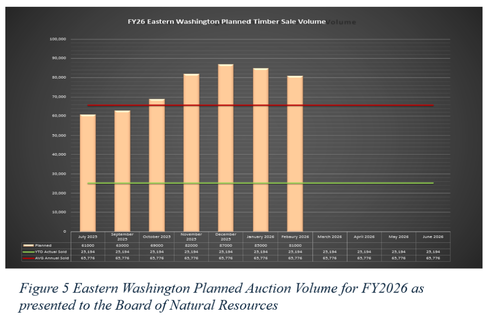 The first half of FY2026 produced the lowest timber sale volumes in Western Washington in 22 years. DNR was only able to sell 114,391 mbf (thousand board feet), just 25% of the 459,000 mbf it told the Board of Natural Resources (BNR) at the January BNR meeting that the Department planned to sell this fiscal year. While the focus of our reporting and the Commissioner’s “Pause” has been on Western Washington timber sale outputs, the sale program in Eastern Washington is not looking positive either.